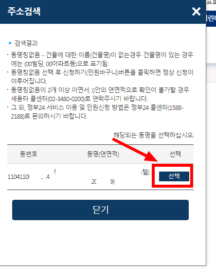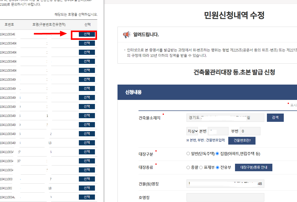 저는 집합건물을 넣어서 주소를 넣었더니 각 호수가 쫙 뜨면서 내가 원하는 주소 호수를 선택하면 되겠습니다
