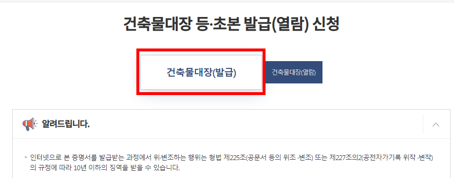 건축물대장 등초본 발급 열람 신청의 발급이 나옵니다