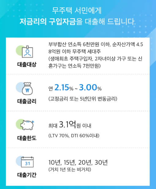 만약 부부가 주택 구입이 생애 처음이거나 가구 자녀수가 2명 이상이거나 신혼 가구일 경우에는 합산 연 소득이 7,000만 원 이하면 해당이 됩니다