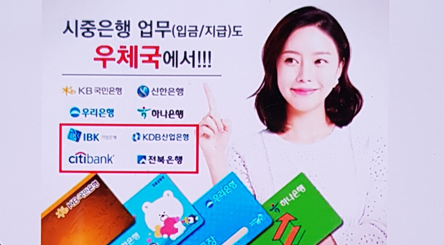 기존에 업무제휴를 맺고 있는 기업, 산업, 시티, 전북은행과 입출금 업무, 조회, 현금인출기 등의 서비스를 이제 4대 은행인 국민, 신한, 우리, 하나은행과 함께 업무를 볼 수 있는데 수수료 없이 우체국에서 가능하게 되었습니다