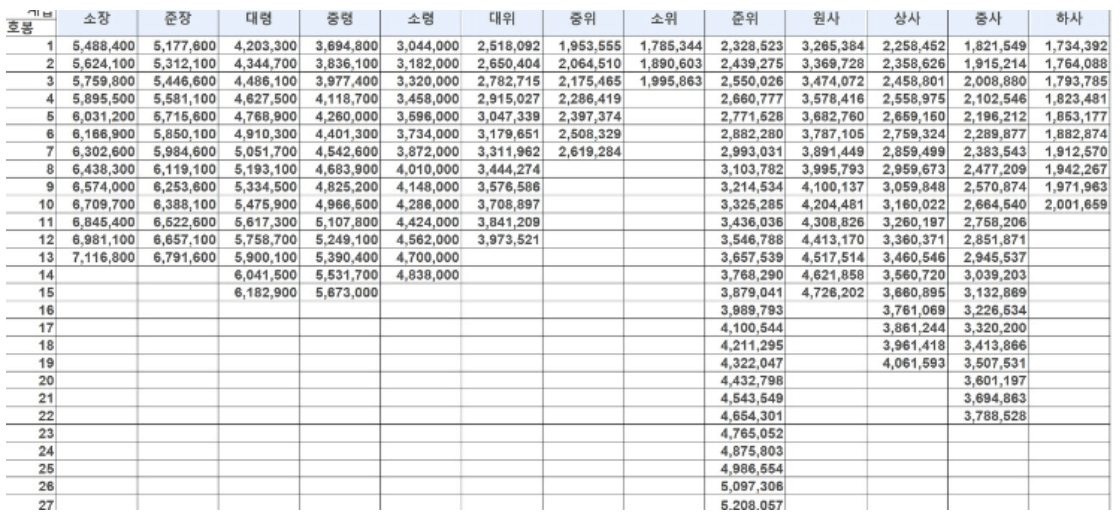 이상 장교, 부사관급의 봉급 내역을 올려봤습니다