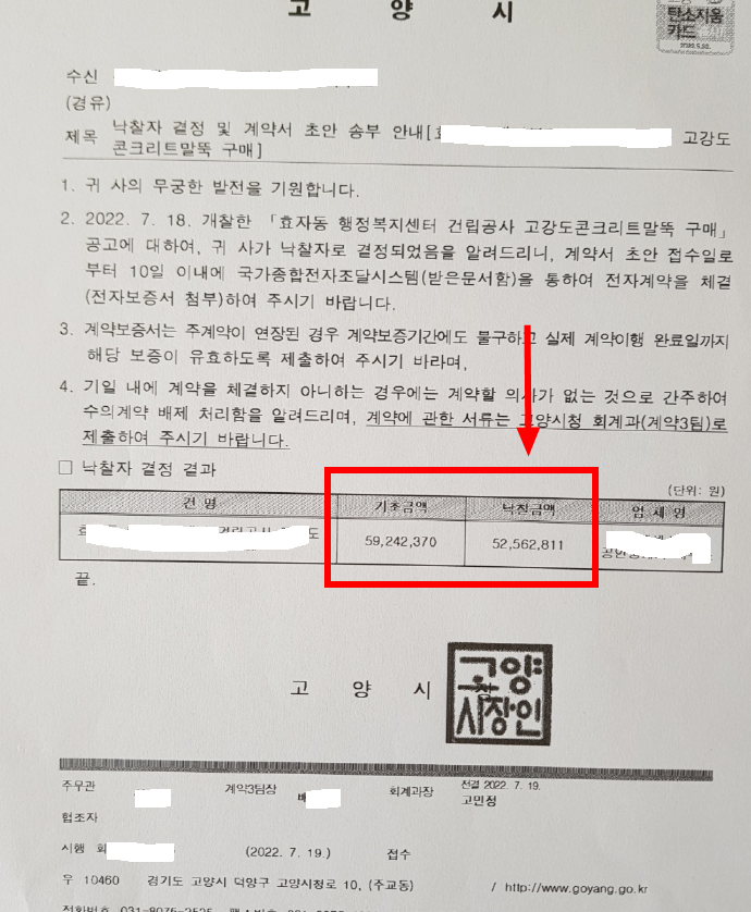--최근에 저는 고양시에서 콘크리트 사업공사를 나라장터 조달 홈페이지에 입찰 참여를 했고 운 좋게 낙찰의 기회를 맞으면서 환호의 순간을 만났습니다