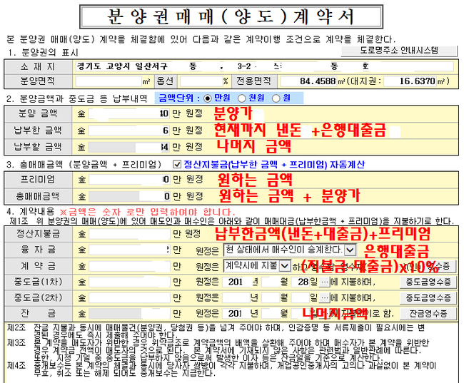 -분양금액과 납부한 금액과 프리미엄 금액을 다 적고 가감한 금액을 최종 적습니다